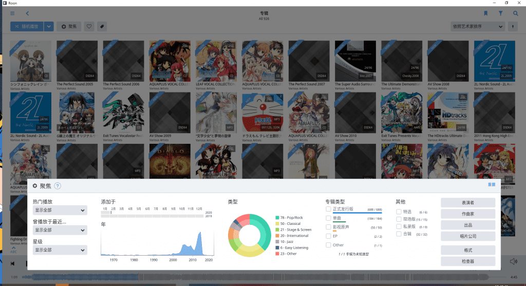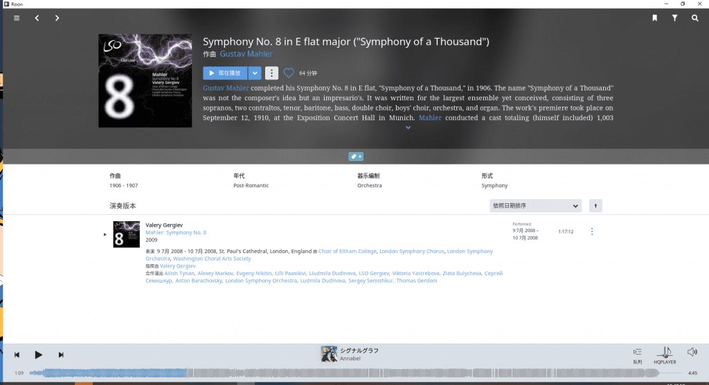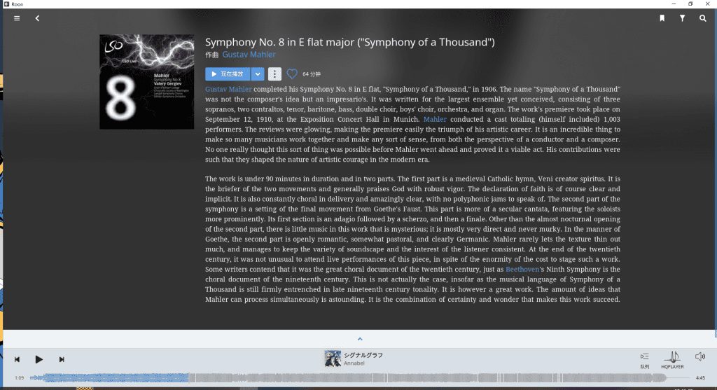 ROON和HQPLAYER都可以算的上是当前最贵的数字播放软件,其中ROON是一个有着良好界面、对古典、欧美曲目支持相当良好的播放器,其较为突出的特点有以下几个方面:
