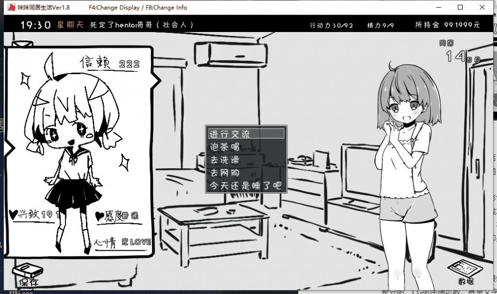 最后说说这部作品的游戏性,主要影响游戏进度的数值只有两个:信赖和兴致,通过反复刷游戏和看电视就可以稳定增长。总体而言这还是一个很普通的刷子游戏。游戏也安排了几个不同的结局,并不难触发。最后,祝各位能爱护好自己的妹妹,享受这个游戏的过程。
