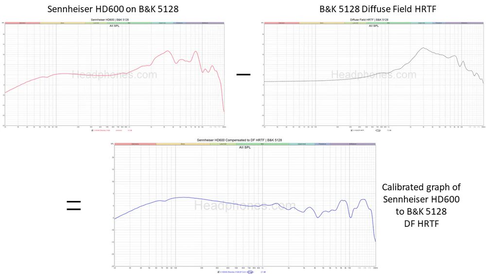 第二个知识点则是“5128 Target Response”,值得应该是使用5128人工耳在自由扩散场中测试得出的标准曲线(目标曲线)。简单来说,就是通过人工耳,绘制出一个“外部声音”经过人耳之后,频响变化的变换函数,然后再通过测试耳机本身的频响曲线,最终通过软硬件调整的方式,使得耳机的频响曲线尽可能贴近目标曲线的调音方式。(如下图所示)