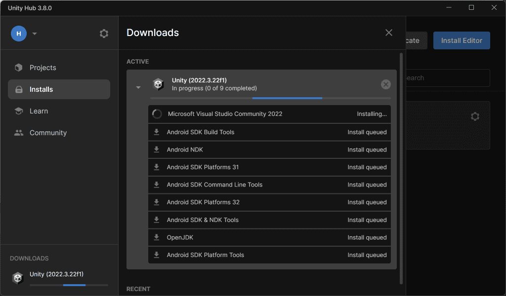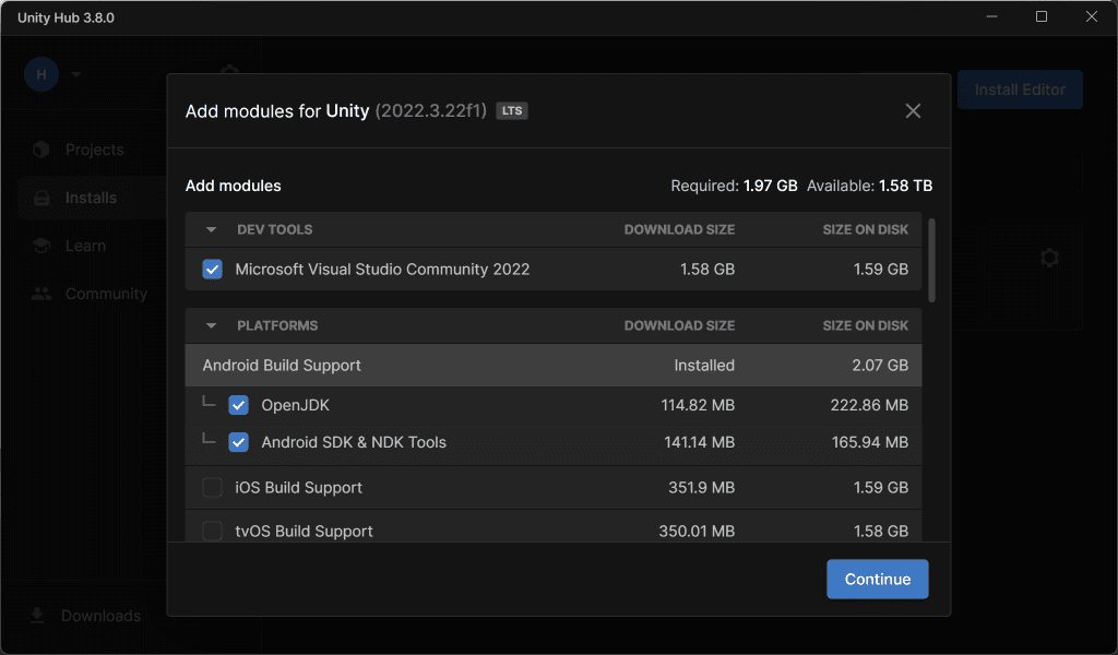 1、UNITY安装Android环境:因为QUEST/PICO本质上是安卓系统,因此如果需要模型在上面能正确读取,需要安装对应的环境。打开UNITY HUB,并根据下图检查是否已经完整安装android环境,如果没有就勾选后直接安装即可。
