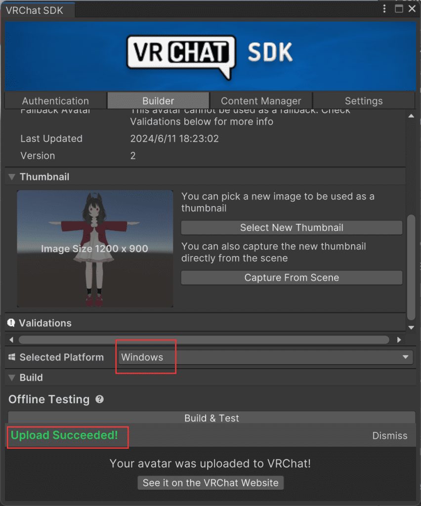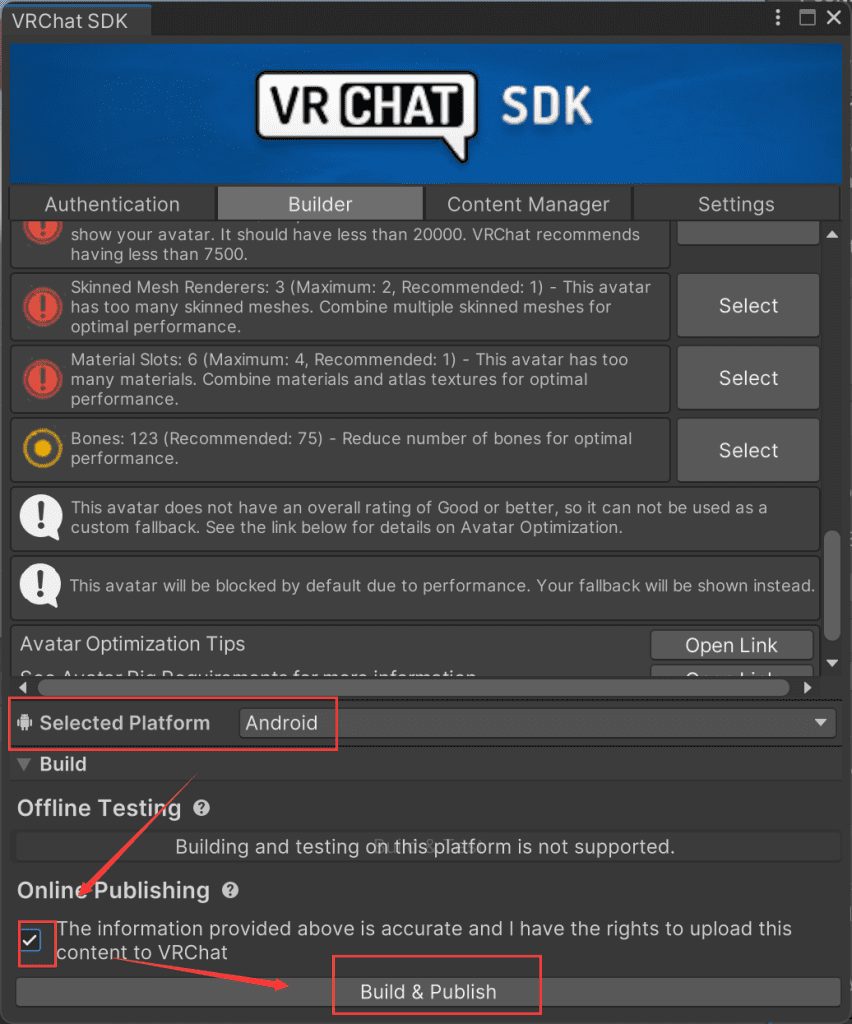 4、上传Android端模型:回到VRChat SDK界面,不要改动名称和预览图片,将“Selected Platform”改成“Android”选项,这里需要等待一段时间。完成之后跟正常上传操作一样,勾选最下方后,点击“Build & Publish”上传即可。