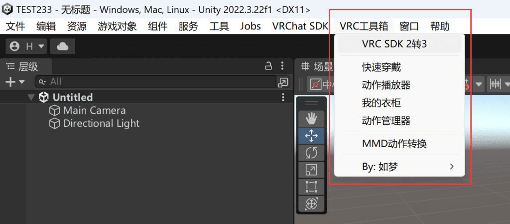 3、加载穿衣插件:本次使用的穿衣插件是“VRChatAvatarToolkit”,可以直接使用BLOG主提供的文件,也可以去发布页下载最新版本(推荐)的插件使用。下载完成后加载到UNITY中,正常加载后会在窗口上方看到“VRC工具箱”菜单。