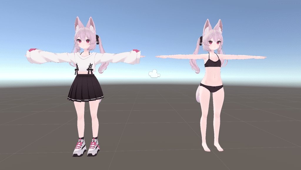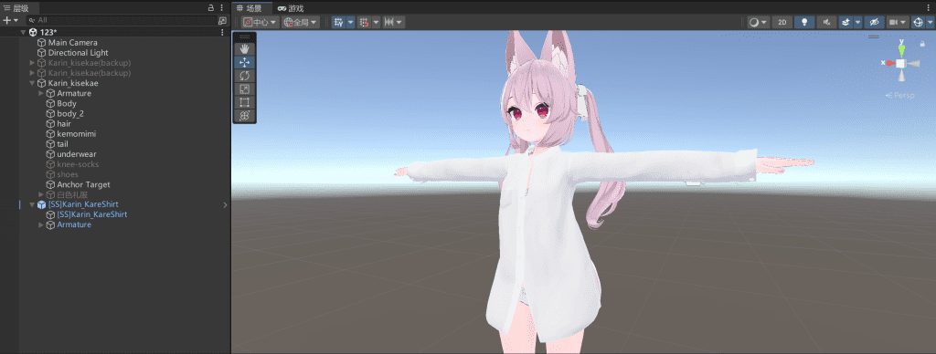 另外部分模型为了节省资源,在看不见的地方能省则省(褒义)。如果我们强行使用左面的Karin模型,会发现一旦脱了上衣,原本衣服遮住的手部和胸部会缺少模型。这时候如果我们穿着的是短袖或者会露出胸前的衣服,则会出现建模问题。如何取舍使用需要根据实际情况实际判断。