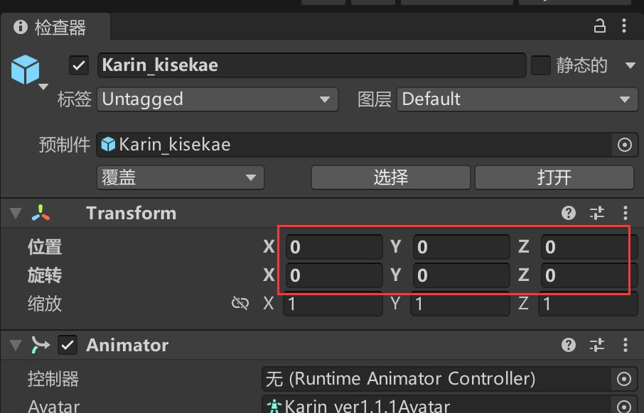 选中模型,随后在检查器上能看到“Transform”选项卡,将位置、旋转的XYZ轴都调成0,将缩放调成1。方便后面对齐衣服。