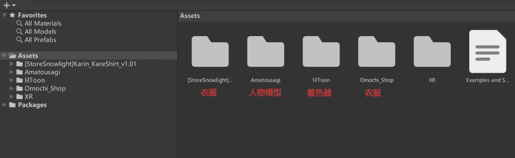 1、添加多件衣服:别关闭刚才的unity项目,我们继续添加下一件衣服“[StoreSnowlight]Karin_KareShirt_v1.01”。这件衣服我们打开就发现丢失了着色器,预制件呈现一团紫色的状态。我们首先点击那个原型的预制件,并在检查器上指定lilToon着色器。另外我们还需要检查各个目录下,是否存在着色器错误的情况,并全部手动指定新的着色器。