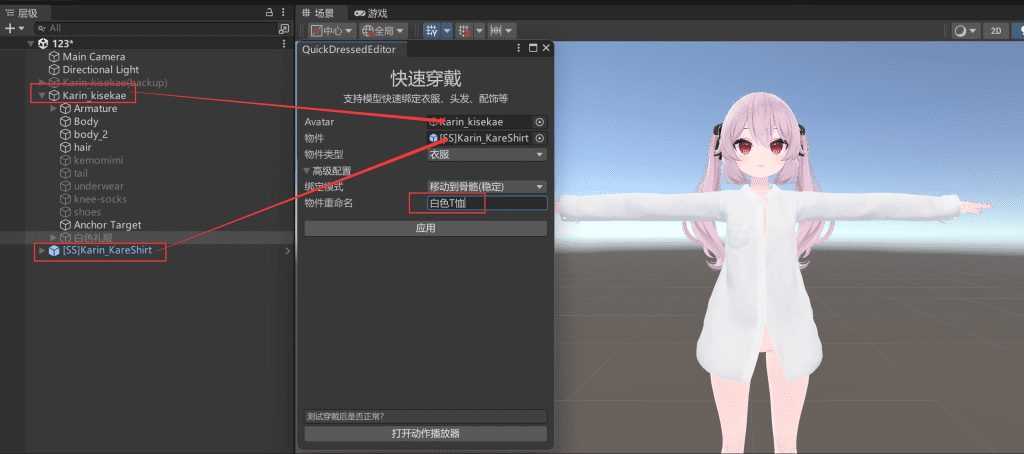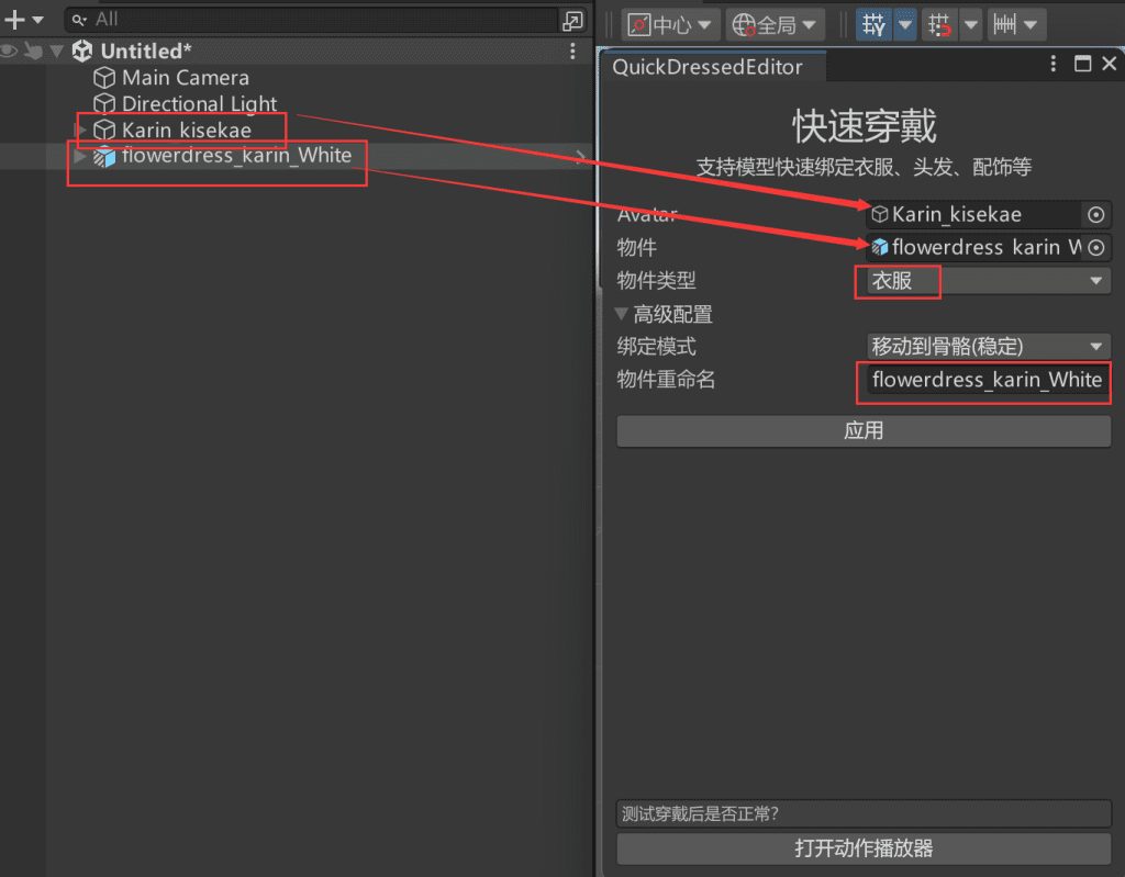 7、快速穿戴:点击UNITY上方工具栏的“VRC工具箱”,并选择“快速穿戴”。然后将Karin本体“Karin_kisekae”拖入快速穿戴窗口(QucikDressedEditor)窗口的“Avatar”栏目中;将衣服本体“flowerdress_karin_White”拖入快速穿戴窗口(QucikDressedEditor)窗口的“物件”栏目中。接着物件类型选择“衣服”、点开高级配置菜单,可以对物件(衣服)进行命名。全部设置完成后,点击“应用”既可完成穿衣。