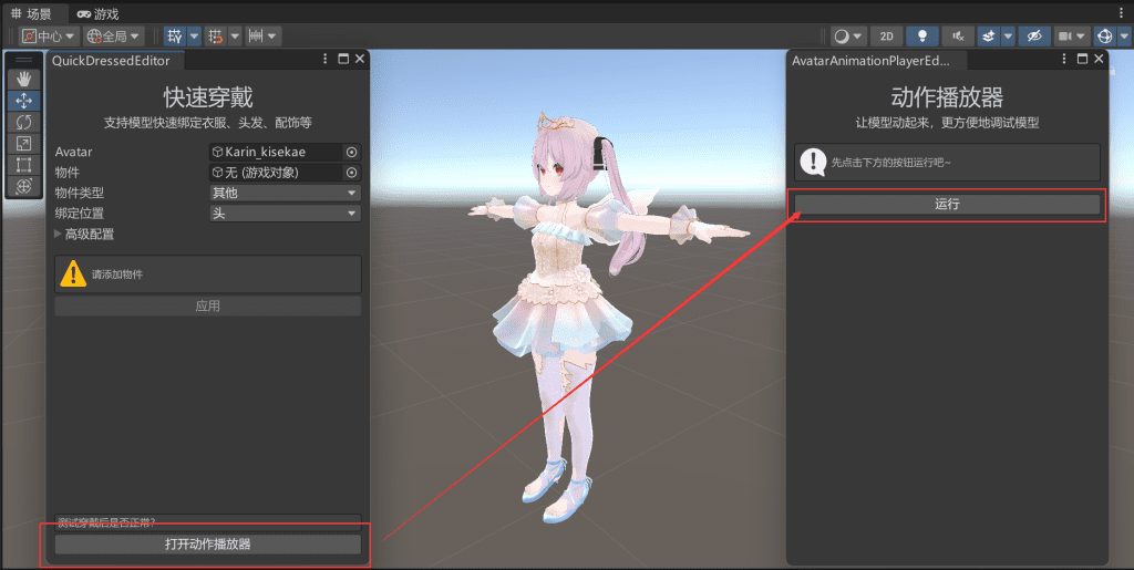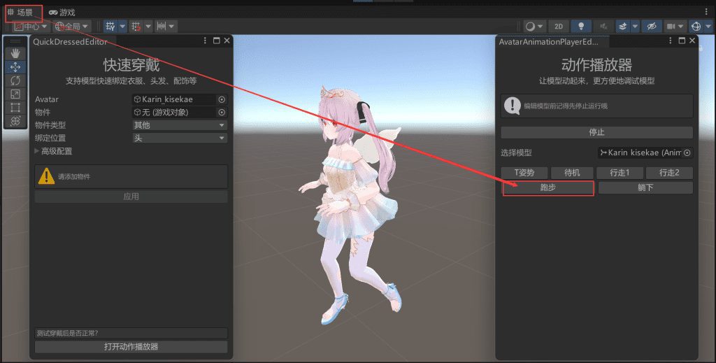 运行动作播放器之后,我们需要切换回“场景”窗口,并且点击“跑步”按钮,我们就能看到角色跑动起来。在这个过程中我们可以检查衣服是否贴合角色,有没有出现严重的问题。(本教程不涉及对模型进行二次修改,因此如果发现模型问题建议找卖家处理)一切测试结束之后,我们点击“停止”按钮既可退出测试。