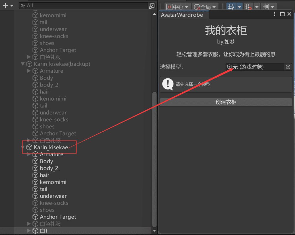 2、新增衣柜:点击Unity上方菜单“VRC工具箱”,选择“我的衣柜”。随后将Karin的模型本体“Karin_kisekae”拖进新窗口的“选择模型”后面的对象框中。