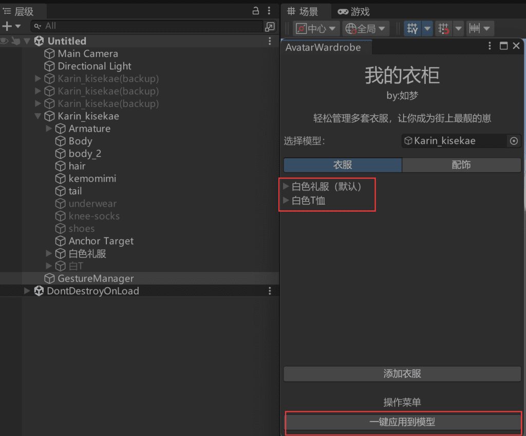 还需要注意,部分衣服针对不同的模型均做了预制件,这里需要注意选出与模型本体“Karin”相匹配(如下图)的衣服。