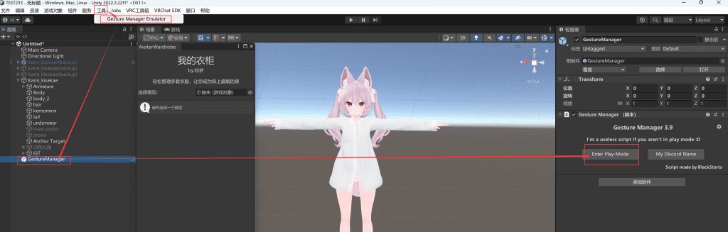 接下来我们要测试衣柜是否正确运行,点击上方菜单“工具”栏,打开“Gesture Manager Emulator”。随后我们会看到“层级”中新增了“GestureManager”组件,点击之后右面检查器会出现相关选项。点击“Enter Play-Mode”,稍等一会就会完成启动测试环境。