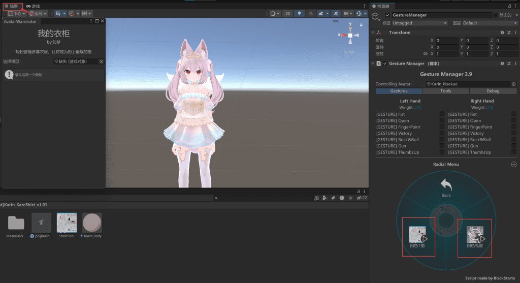 切换回“场景”框,右下角圆盘跟VRCHAT游戏中功能和样式都是一致的。依次点击“Expressions”、“换装”就可以看到我们制作好的服装。至此,衣柜功能已经介绍完毕,随后我们可以直接上传到VRCHAT上既可使用这个自带两套服装的Karin了。