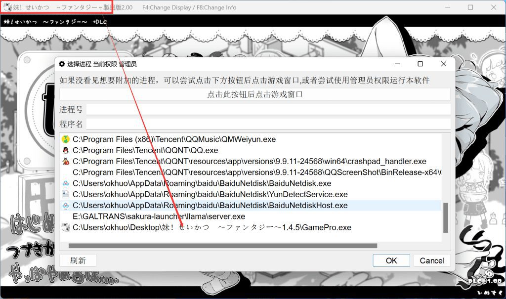 5、对游戏进行实时翻译:点击如下图所示圆圈的按钮,然后在弹出的窗口中,找到游戏标题名称的进程文件,选择之后点击OK。