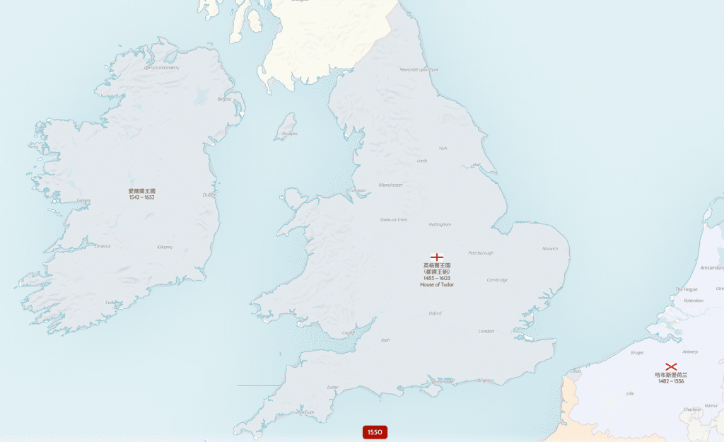 都铎王朝的统治(1485-1603):1485年,亨利·都铎(亨利七世)在博斯沃思原野击败理查三世,约克王朝走到了终点。亨利·都铎的成功并非源自于自己强大的武力或强大世袭贵族的支持,相反他是凭借这自己身上不太牢靠的血统、流亡者的运气、国际援助以及战场上对手的临阵倒戈而获胜的。