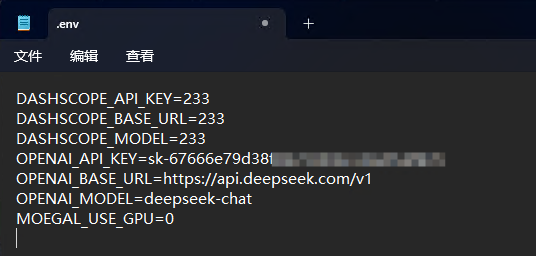 用记事本打开“.env.example”文件,我们可以看到“DASHSCOPE”和“OPENAI”两个部分。其中DASHSCOPE指的是阿里QWEN的接入点,而deepseek则可以选择OPENAI的接入点。下面以blog主自己的deepseek接入点为例,大家可以参考。另外最后一行“MOEGAL_USE_GPU”是询问是否调用GPU进行OCR,0是使用CPU,1则是使用GPU(仅支持N卡)。各位可以根据自己的实际情况来选择。