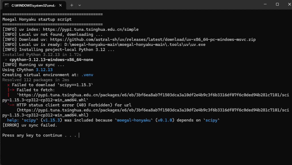 如果这一步出现如上图所示的报错,是因为拉取的镜像出现问题。我们用文本打开“start.cmd”,搜索“https://pypi.tuna.tsinghua.edu.cn/simple”,替换成“https://pypi.org/simple”或者“https://mirrors.aliyun.com/pypi/simple/”,保存后重新运行即可。