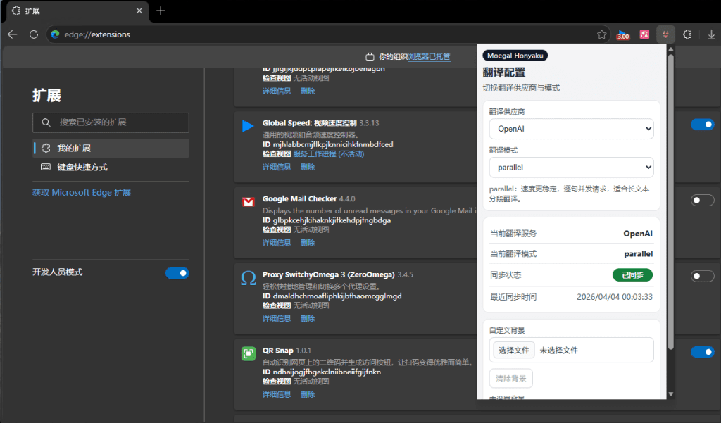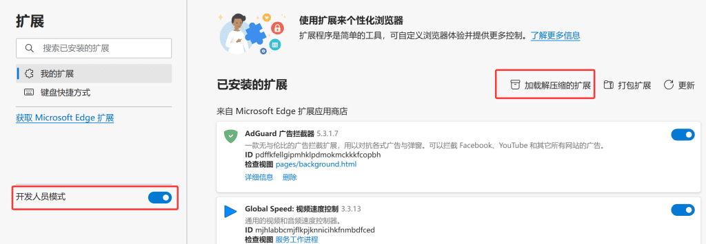 确保插件文件夹已经解压缩,接下来以EDGE为例进行安装。在浏览器上输入“edge://extensions/”回车,打开扩展页面。打开“开发人员模式”,随后点击右面出现的“加载解压缩的扩展”按钮。然后指定刚刚解压缩的插件文件夹。